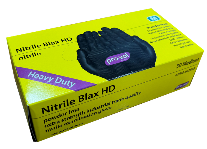 Nitrile Blax HD are heavy duty nitrile gloves, extra thick for strength and durability while maintaining elasticity. The unique raised diamond texture on the glove provides outstanding grip and dexterity even when used in greasy environments. Examination grade and Industrial trade quality, these gloves are highly resistant to puncture, solvents and grease with a broad range of chemical resistance.