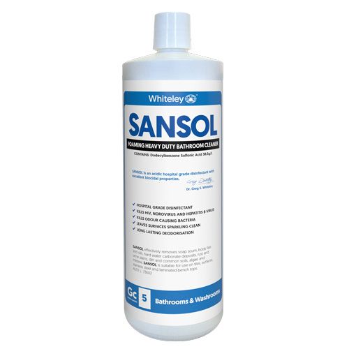 Sansol effectively removes body fats and oils, hard water carbonate deposits, rust and urine/faeces stains, soap scum, algae and mildew. Sansol is suitable for use on tiles, glass surfaces, stainless steel and laminated bench tops. Sansol has been successfully used on ventilation systems to eradicate odour causing bacteria. AUST L: 73602