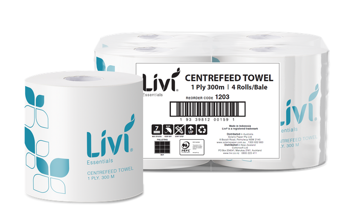 HAND TOWEL - LIVI ESSENTIALS CENTREFEED 1 PLY 300 MTR × 4 ROLLS