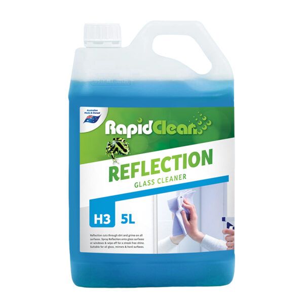 RapidClean Reflection – Glass Cleaner is a clear blue liquid. It is a dual action, hard surface and window cleaner.It combines a powerful blend of detergents and degreasing agents to easily cut through grease and dirt while leaving a streak-free finish.