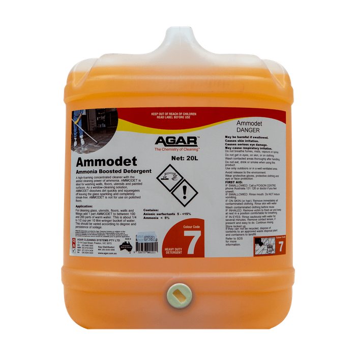 A high-foaming concentrated cleaner with the added cleaning power of ammonia. AMMODET is ideal for washing walls, floors, utensils and painted surfaces. As a window-cleaning solution, AMMODET dissolves dirt quickly and squeegees off, leaving the glass sparkling and completely streak-free.